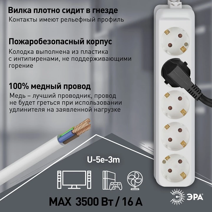 Удлинитель Эра U-5e-3m-3x1,5 — отзывы